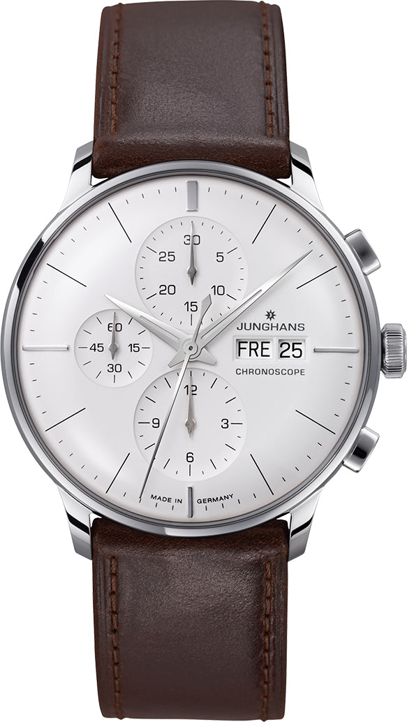 Junghans Meister Chronoscope Watch 27/4120.02. Elegant or dynamic? A moot consideration for the Meister Chronoscope. After all, this watch effortlessly combines classic charm with sporty functions. The characteristic, bowl-like dimples for the auxiliary dial are a typical feature for the Meister range.