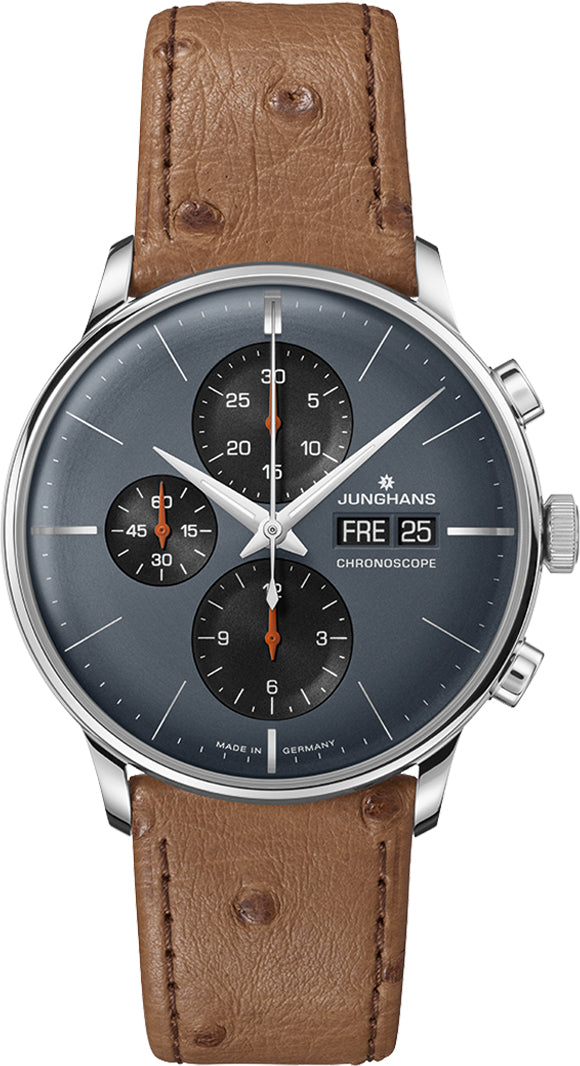 Junghans Meister Chronoscope Watch 27/4224.02. Elegant or dynamic? A moot consideration for the Meister Chronoscope. After all, this watch effortlessly combines classic charm with sporty functions. The characteristic, bowl-like dimples for the auxiliary dial are a typical feature for the Meister range.