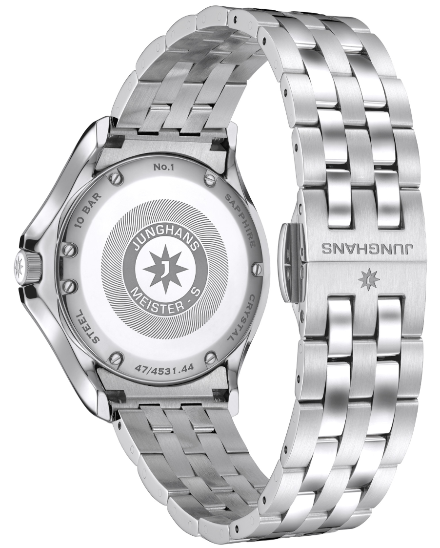 Junghans Meister S 35 Quartz Watch 47/4530.44. The Meister S Quarz 35 by Junghans puts a distinct focus on colour, showing the sporty line in a whole new light. For modern, active watch fans, this new timepiece in a smaller size complements contemporary style – whether the wearer is at work, in the swimming pool, or on a bike ride. Outfitted with a 35mm stainless-steel case and a fine steel bracelet, this dynamic midsize watch combines current design with sporty elegance and precision, making it the perfect 24/7 timepiece.