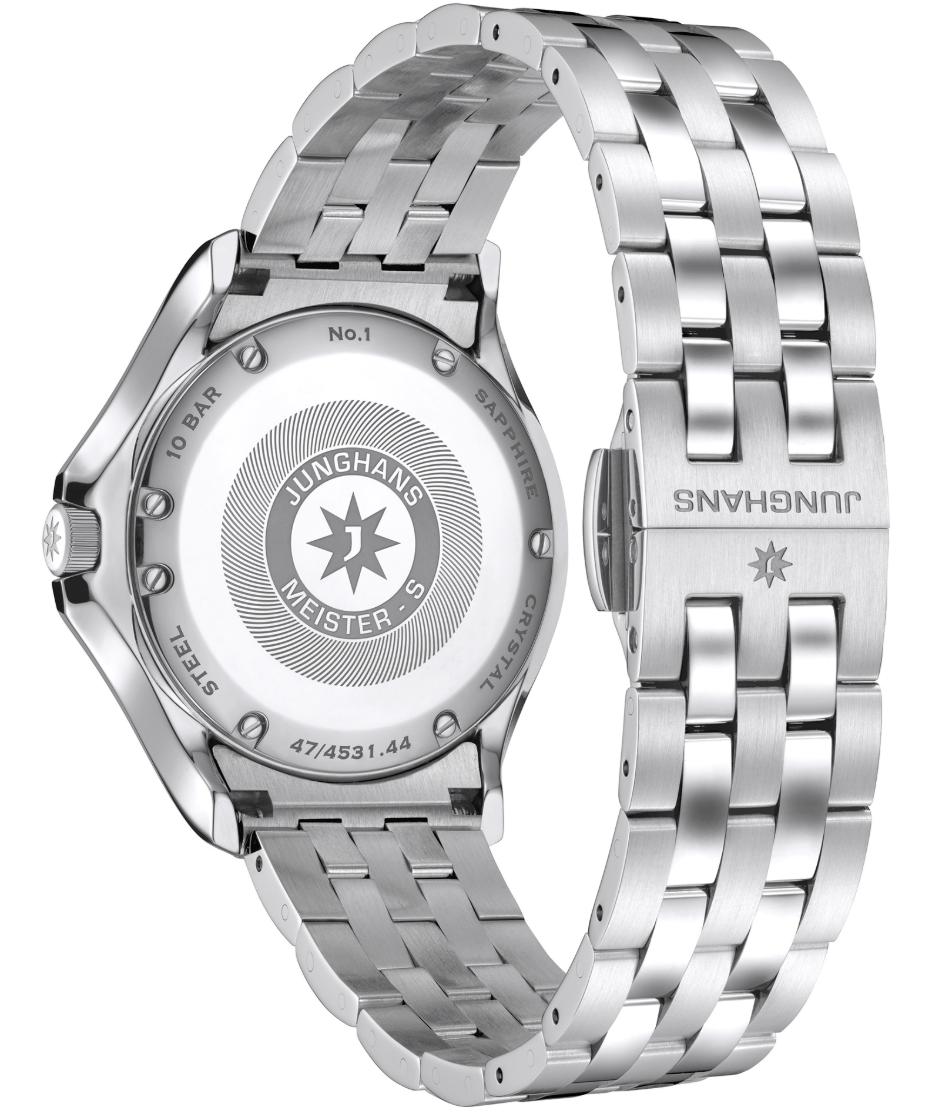 Junghans Meister S 35 Quartz Watch 47/4532.44. The Meister S Quarz 35 by Junghans puts a distinct focus on colour, showing the sporty line in a whole new light. For modern, active watch fans, this new timepiece in a smaller size complements contemporary style – whether the wearer is at work, in the swimming pool, or on a bike ride. Outfitted with a 35-millimeter stainless-steel case and a fine steel bracelet, this dynamic midsize watch combines current design with sporty elegance and precision, making it the perfect 24/7 timepiece.