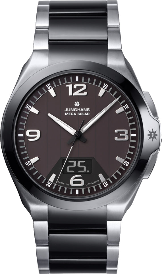 Junghans Spektrum Mega Solar Watch 18/1120.44. Cool stainless steel, scratch-resistant ceramics and waterproof up to 10 bar, the Spektrum Mega Solar is our sportiest radio-controlled watch. The internal workings of the Junghans multi-frequency radio-controlled movement is powered by the energy of the sun. Not only has the Spektrum Mega Solar proven itself to be incredibly accurate, but is also an extremely eco-friendly timekeeper requiring fewer resources.