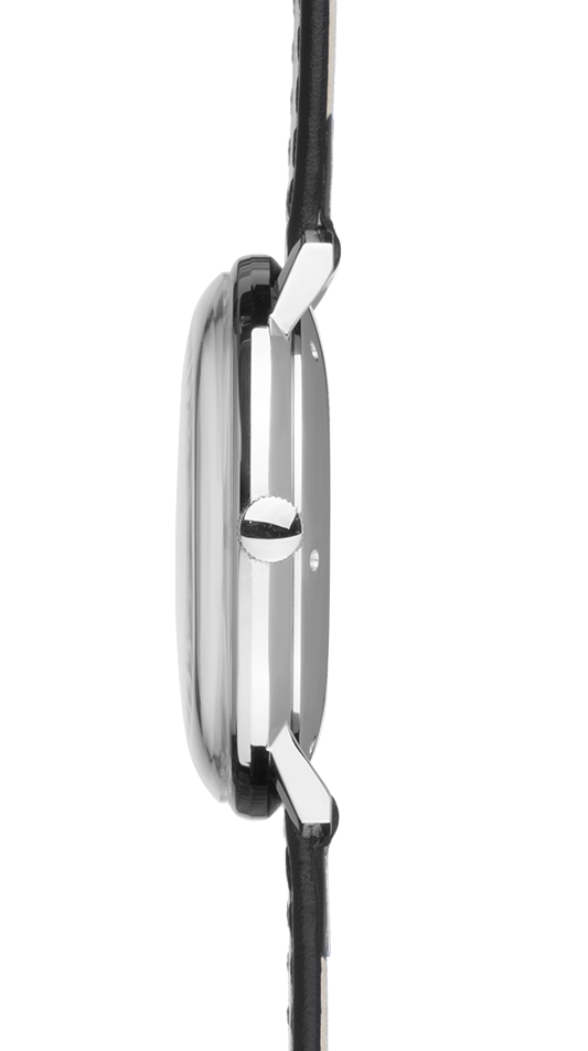 The gorgeous stainless steel case of this Junghans Max Bill watch measures to a neat 38mm in width and only 10mm in height allowing it to mould elegantly to the wrist with the help of an elegant black calfskin leather strap and stainless steel pin buckle. Housed within the case is the J800.1 automatic winding movement which equips the watch with hour, minute and seconds function, a handy date window at 3 o’ clock and a power reserve of 38 hours. The polished black dial is detailed with environmentally friendly luminous hour and minute hands which are housed beneath convex hard Plexiglass, a material famed for its scratch resistance and treated with Sicralan coating for optimal legibility.