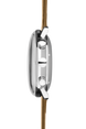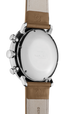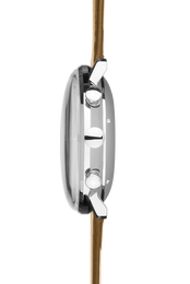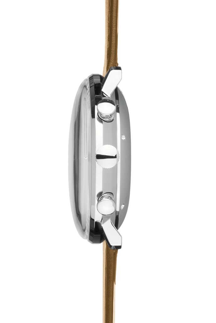 The gorgeous stainless steel case of this Junghans Max Bill Chronoscope watch measures to a comfortable 40mm in width and only 14mm in height allowing it to mould elegantly to the wrist with the help of an elegant brown calfskin leather strap. Housed within the case is the J800.2 automatic winding movement which equips the watch with central hands for hours, minutes and chronograph seconds, 30 minutes counter, 12 hour chronograph counter, a date display and a power reserve of 42 hours. The smooth silver plated dial and luminous hour and minute hands are housed beneath convex hard plexiglass that has been specially coated with a scratch resistant treatment for optimal durability.