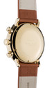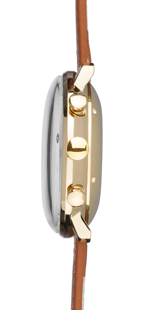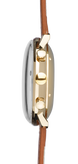 The gorgeous yellow gold plated stainless steel case of this Junghans Max Bill Chronoscope watch measures to a comfortable 40mm in width and only 14mm in height allowing it to mould elegantly to the wrist with the help of an elegant brown calfskin leather strap. Housed within the case is the J800.2 automatic winding movement which equips the watch with central hands for hours, minutes and chronograph seconds, a 30 minutes counter, 12 hours counter, date display and a power reserve of 42 hours. The smooth silver plated dial and luminous hour and minute hands are housed beneath convex hard plexiglass that has been specially coated with a scratch resistant treatment for optimal durability.