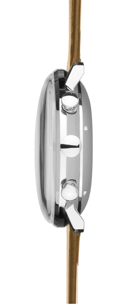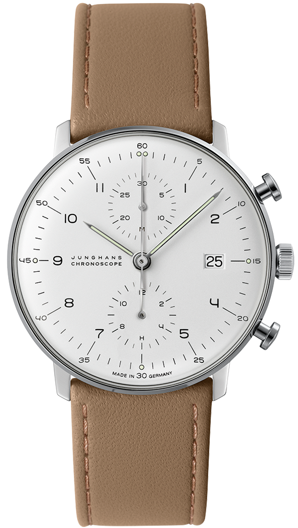 Junghans Watch Max Bill Chronoscope 27/4502.02. As with all pieces in this collection, the design of the mechanical max bill Chronoscope is highly impressive due to its focus on the bare essentials. This is clearly evidenced in the plain, minimalistic design of the dial. Relinquishing display of the small seconds creates a particularly striking symmetry.