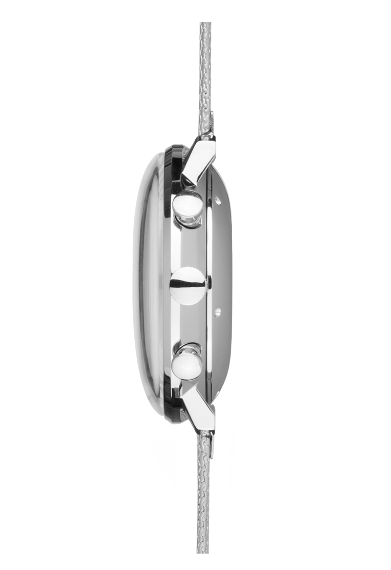 Junghans Watch Max Bill Chronoscope Sapphire Crystal 27/4003.46. As with all pieces in this collection, the design of the mechanical max bill Chronoscope is highly impressive due to its focus on the bare essentials. This is clearly evidenced in the plain, minimalistic design of the dial. Relinquishing display of the small seconds creates a particularly striking symmetry.
