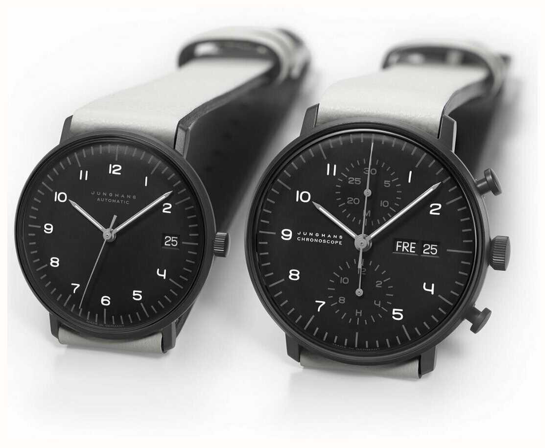 Both Junghans Max Bill 2020 watches within the set are powered by the J880.1 automatic winding movement which provides hours, minutes, seconds and date. The Chronoscope variation also features chronograph dials for 12 hours and 30 minutes and a day window at 3 o’clock. The matte black PVD stainless steel cases blend together wonderfully with the matte black dial decorated with juxtaposing Arabic numerals and sleek luminous hands. Continuing with the engrossing interplay of black and white, both Junghans Max Bill Limited Edition 2020 watches are fitted with bright white calfskin leather straps and classic black PVD stainless steel pin buckles. For days when white might be too much, the set also comes with two additional black calfskin leather straps that can be easily changed over thanks to the quick release system.
