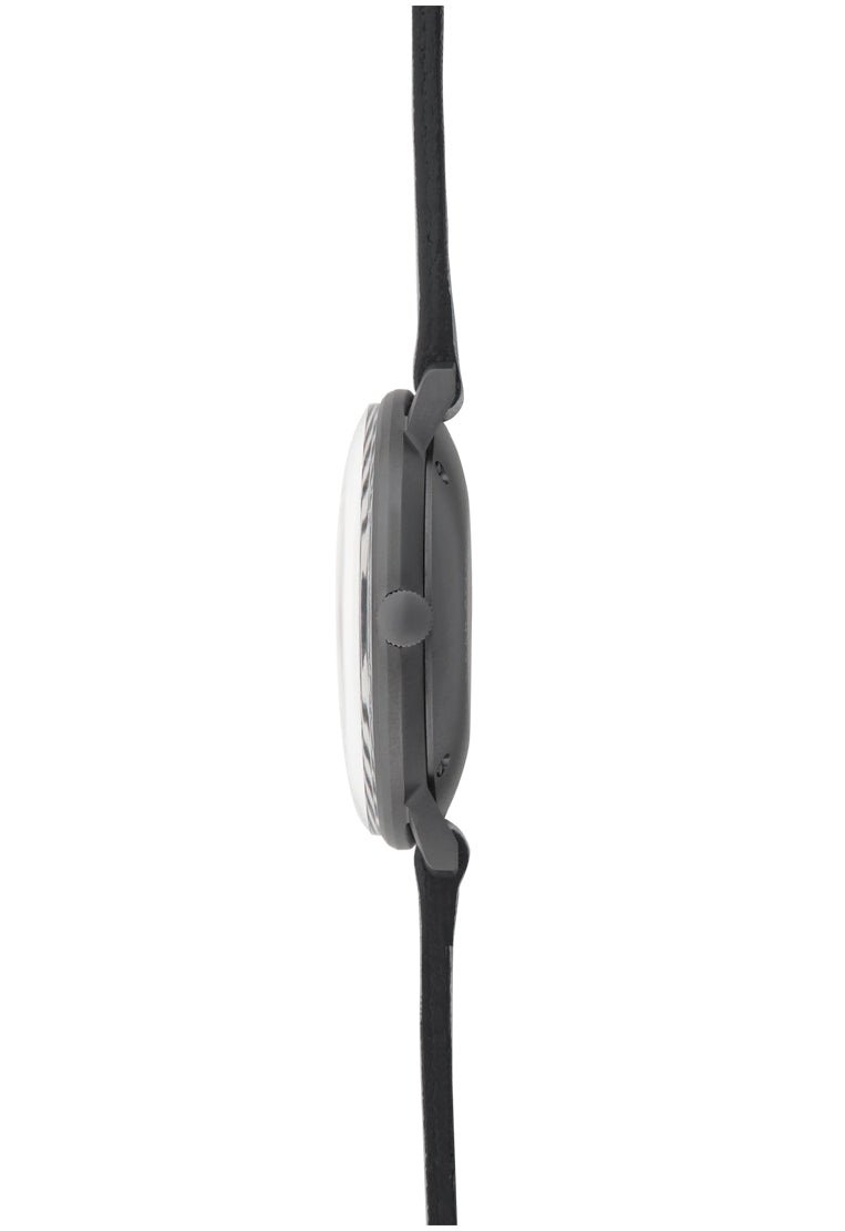 The black PVD coated stainless steel case of this Junghans Max Bill Kleine watch measures to a comfortable 34mm in width and only 10mm in height allowing it to mould elegantly to the wrist with the help of an elegant grey calfskin leather strap and pin buckle coated in black PVD. Housed within the case is the J800.1 automatic winding movement which equips the watch with central hands for hours, minutes and seconds, a date window at 3 o’clock and a healthy power reserve of 38 hours. The smooth matte white dial is adorned with environmentally friendly luminous hour and minute hands and kept protected beneath domed sapphire crystal, a material renowned for its scratch resistance and anti-reflective treatment.