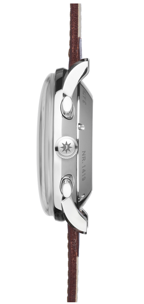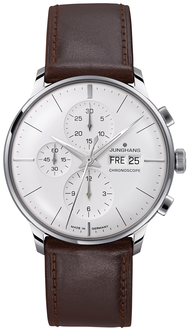 Junghans Watch Meister Chronoscope English Date 27/4120.03. Elegant or dynamic? A moot consideration for the Meister Chronoscope. After all, this watch effortlessly combines classic charm with sporty functions. The characteristic, bowl-like dimples for the auxiliary dial are a typical feature for the Meister range.