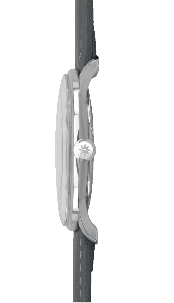Like most Junghans watches, the Junghans Meister Driver Handaufzug uses convex hard Plexiglass with a SICRALAN coating which strengthens the glass and improves its scratch resistance. Beneath the glass, a stunning anthracite grey lacquer effect dial is set with a small sand coloured seconds dial and hands and appliques that have been painted in a luminous substance allowing for easy readability. For the finishing touch, the watch is completed by a matching grey leather strap with beautifully subtle white stitching and a stainless steel pin buckle.