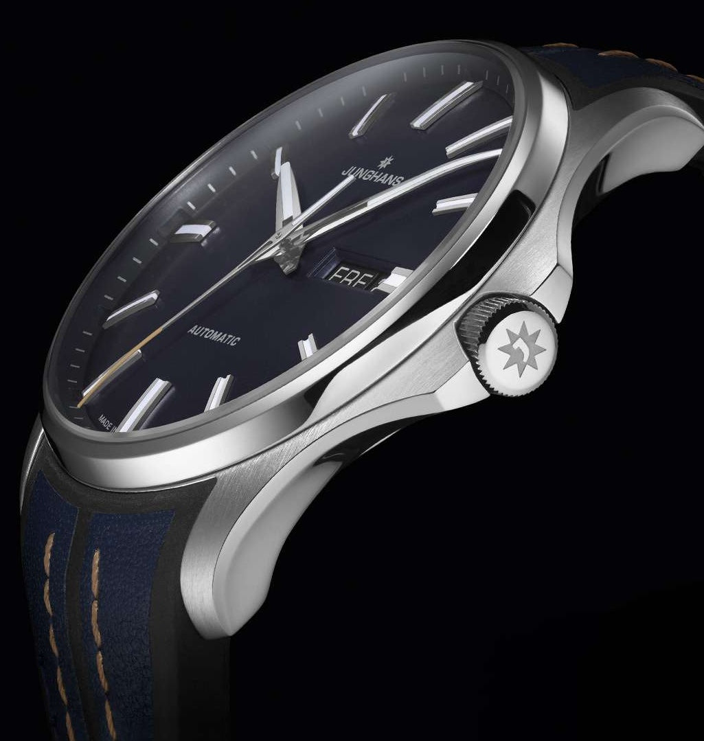 Junghans Watch Meister S Automatic English Day Date 27/4211.00. At work. At sports. At leisure. Whenever and wherever you may be, the Meister S Automatic in midnight blue always retains its uncompromising functionality. And uncompromising aplomb. The ergonomic bracelet has raised Junghans lettering in the synthetic rubber to allow the skin to breathe.