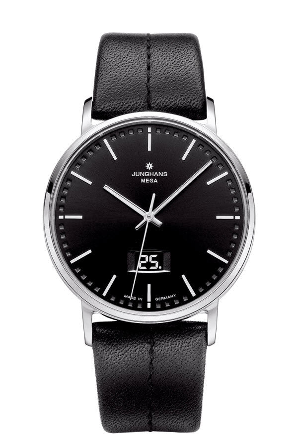 The sleek stainless steel case of this Junghans Milano watch measures to a comfortable 41mm width and 10.7mm height and housed within the steel is the radio controlled movement J615.61 which offers a digital date feature at six o clock. The timepiece also boasts appropriate scratch resistant sapphire crystal glass that sits above the matte black dial detailed with a minute track and luminous set hands. To complete the watch, a gorgeous black calf leather strap and stainless steel buckle is added.