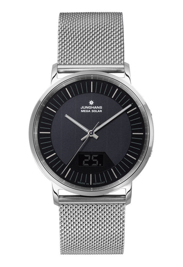 This Junghans Milano Mega Solar watch combines the latest technology of multi frequency radio controlled solar movements with a lightweight stainless steel and open case back design. The ingenious high precision radio solar movement means this watch is completely independent of limited energy resources and provides exact timekeeping on three continents using only the power of sunlight.