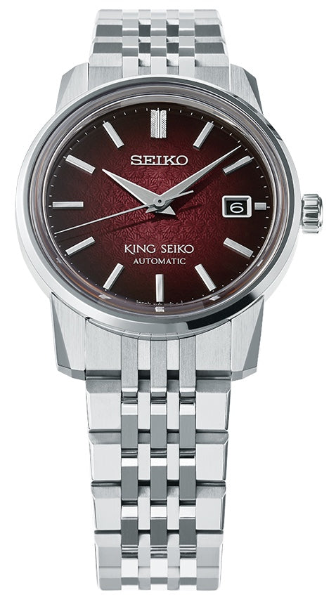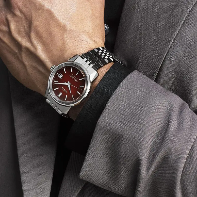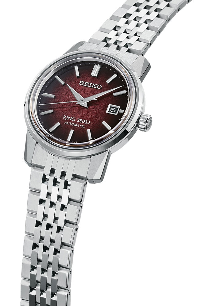 The dial of this ‘Garyu-Bai Red’ timepiece features a new plum blossom pattern in a bright red gradation. Under a box sapphire crystal glass are a set of sharp Dauphine-style hands with multifaceted edges. It features the signature King Seiko sharp, angular brushed finish case design and an intricate seven-piece bracelet.