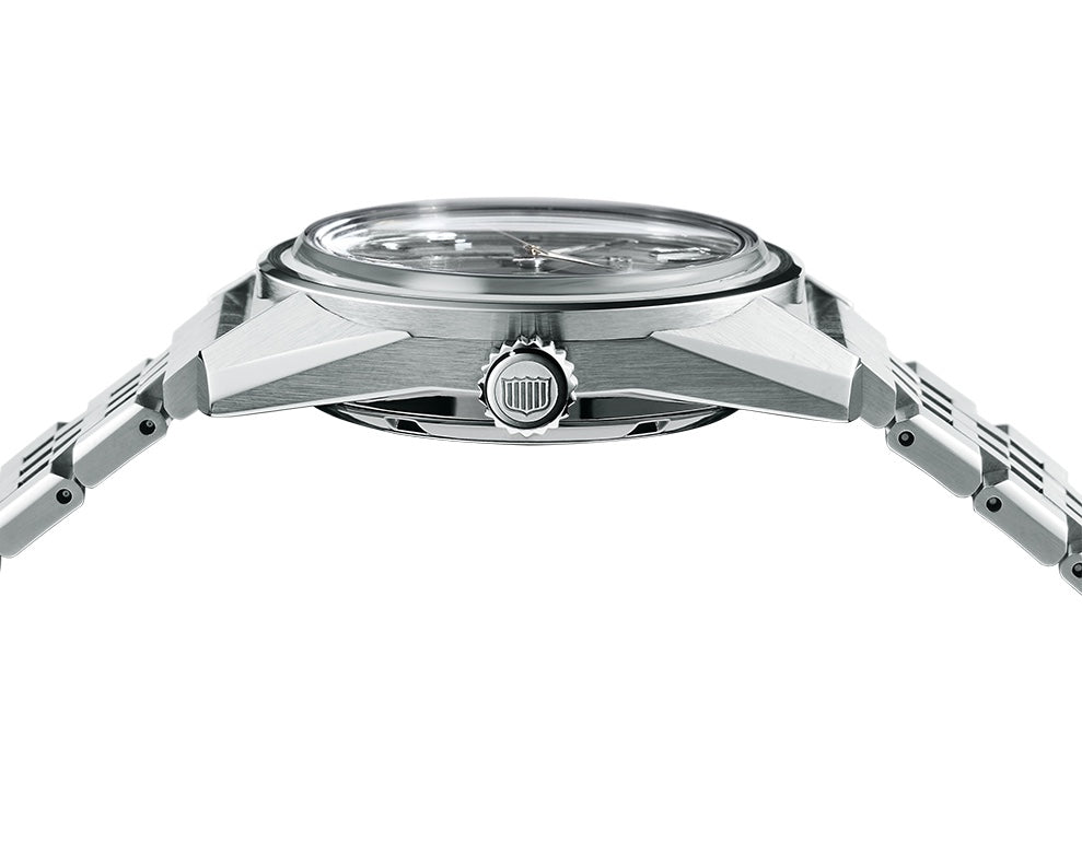 Under a box-sapphire crystal glass is a classic green dial, with sharp Dauphine-style hands. Three-dimensionally cut batons, a sharp angular case style, and the finishing ensures maximum light reflection. With an interchangeable bracelet design, this compact 36mm piece allows for easier bracelet and strap customisability.