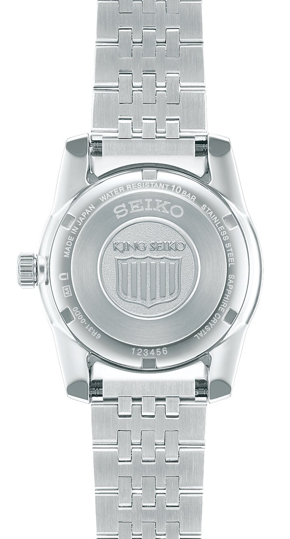 This version is updated from its original inspiration with a newly developed slim structure combined with a sapphire box glass, for a case depth of 10.33mm, the slimmest of 6R calibre models. It features a King Seiko crest mark on the crown and caseback and the bracelet is inspired by the original 1960s design through a combination of mirror and hairline finishing.