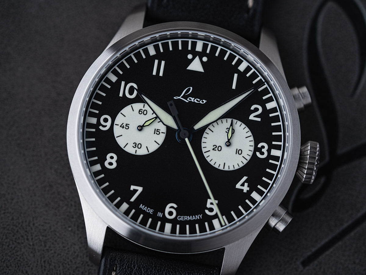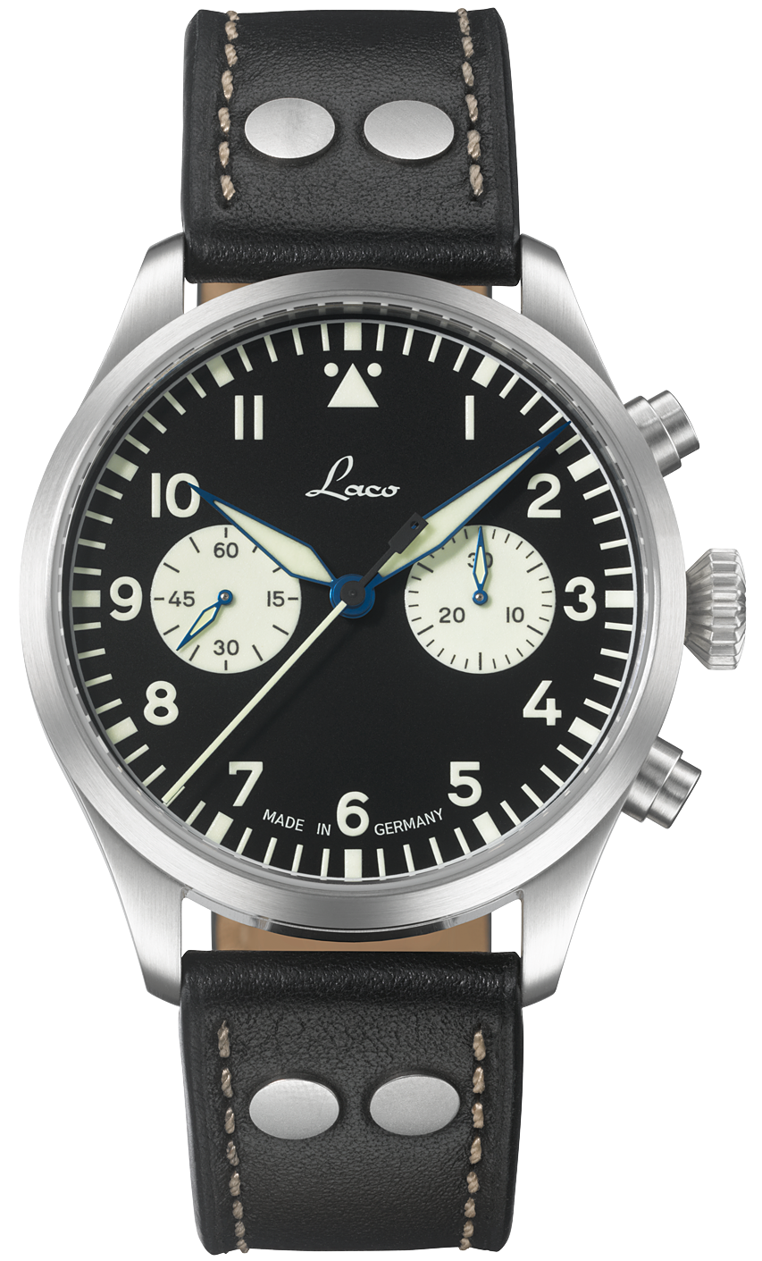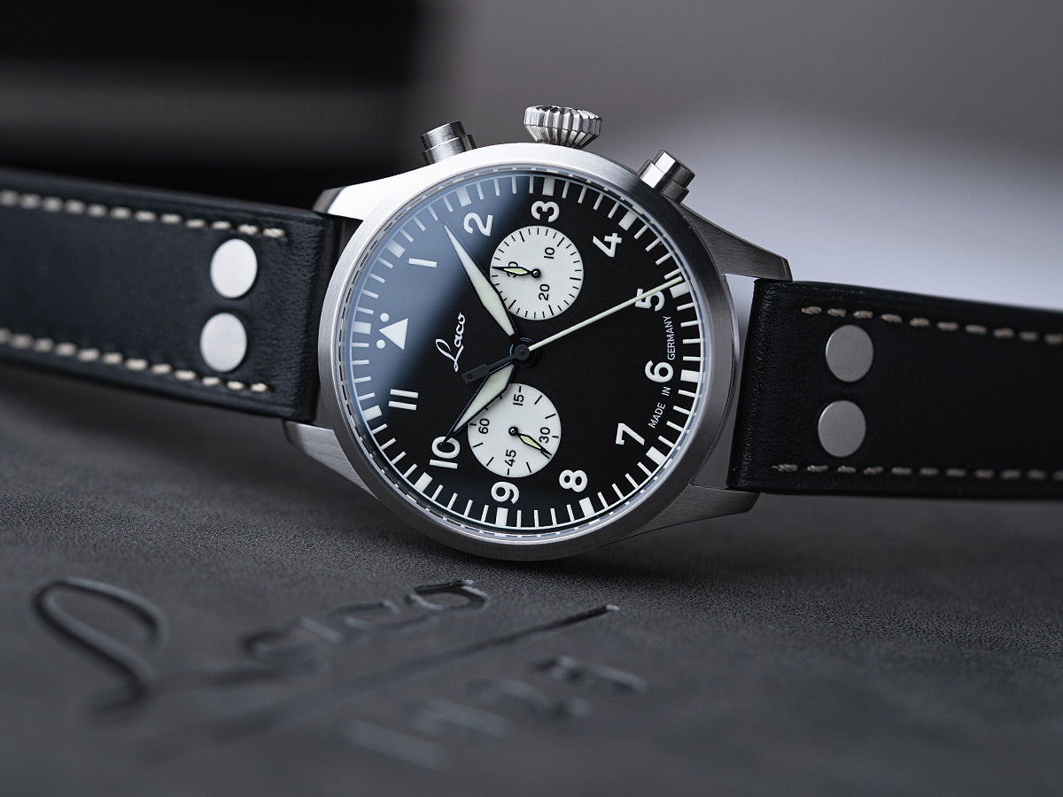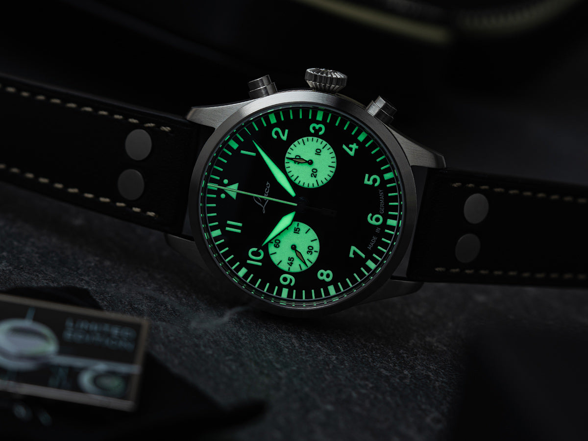 Laco Watch Pilot Edition 98 Chronograph Limited Edition 862166. The luminous Bicompax chronograph "Edition 98" is a tribute to the adventurers of the skies and the explorers of the night. It was not only created to measure time, but also to show the way in the dark. Not only the strict limitation of only 98 pieces, but also the two luminous totalizers at 3 and 9 o'clock make it something very special.