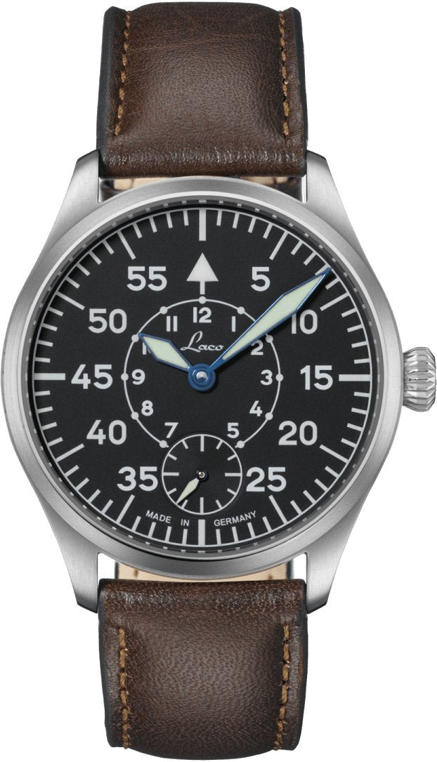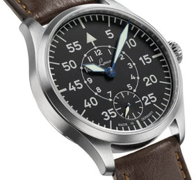Laco Watch Pilot Wurzburg 862119. Pilot watches with a business look. Vintage charisma, yet totally up to date, the two new Laco pilot watches combine elegant retro designs with a touch of class. The 11mm high case of the Ulm and Wurzburg watches fits snugly onto the wearers wrist, easily going under shirtsleeves too. The slim profile and balanced proportions of both timepieces makes them highly versatile, as stylish accessories for a variety of occasions, in business or leisure settings. Both models house a precision hand wound Laco 98 movement and have a small second hand at the six o clock position.