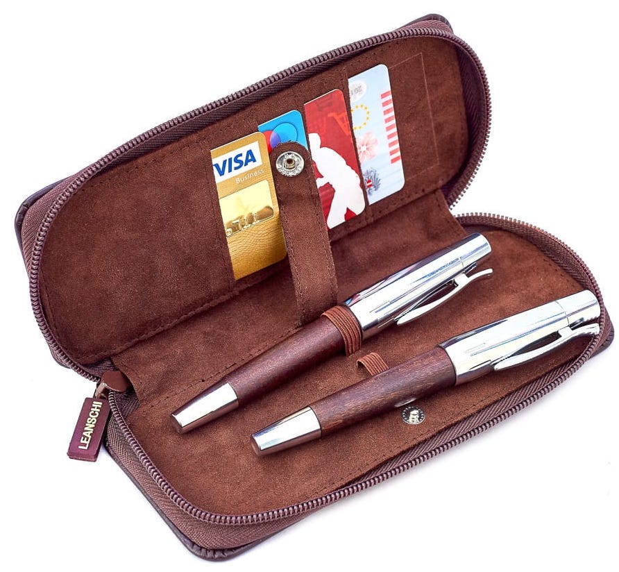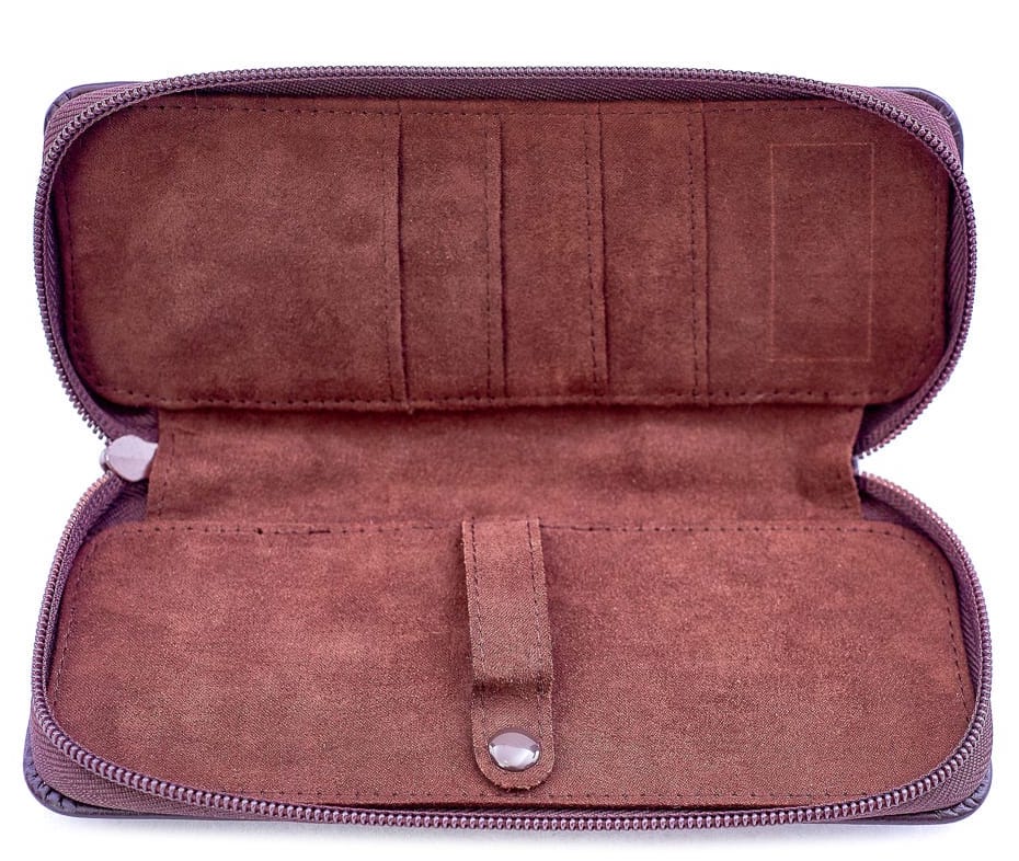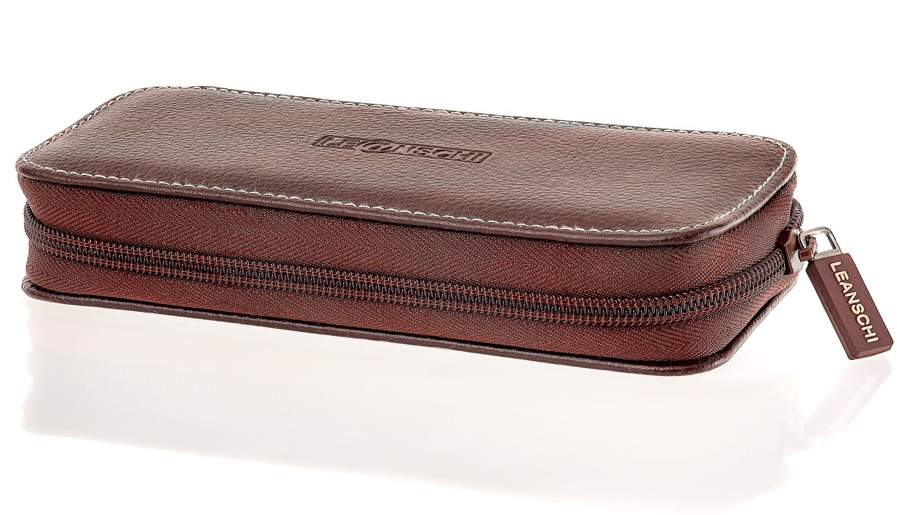 Leanschi Watch Case Chocolate Brown UPO1-CHOC. This practical, compact ZIP-pouch is ideal for the transportation of a single watch, for a watch-repair or as a box for 2 pens. Thanks to its interior smart fixtures, some credit- or guaranty cards could easily be added. It easily fits in a coat pocket or in a bag.