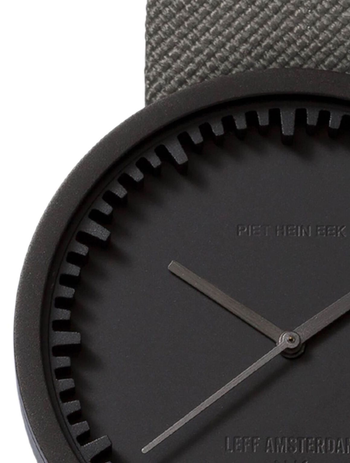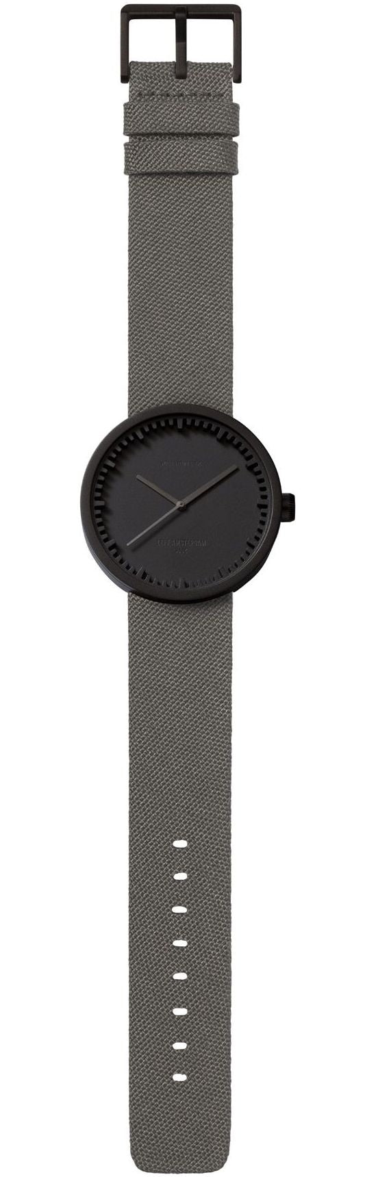 LEFF Amsterdam Watch Tube D38 LT71015. For the design of the Tube watch we teamed up with Dutch Designer Piet Hein Eek. Piets unparalleled vision on design and LEFF amsterdams raw, industrial and sophisticated approach, came together in an amazing collection of refined yet tough watches. The design of the Tube watch has an iconic ring that functions as the clocks face. Therefore, you can recognize every LEFF amsterdam watch by this unique characteristic. The black watch case is made of high quality 316L stainless steel, contains an analogue movement and has a diameter of 38mm. The gray Cordura belt has a length of 20 cm and is also available in the combination black green and black sand colored. Cordura is known for its durability and resistance to wear and tear. The watch contains a Japanese Miyota timepiece and a glass plate made of Mineral glass. The details in the crown are cut with a diamond. This Tube Watch has a water resistance of 5ATM.