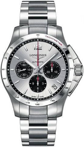 Measuring to a comfortable 44.5mm in size, this bold Longines Conquest Chronograph watch boasts a stunning stainless steel case, transparent case back and stainless steel bracelet with folding style clasp. Hidden within the case is the L688 automatic movement which equips the watch with hour and minutes function, a small second at 9 o clock, a date aperture at 4 o clock and chronograph function. The exquisite column wheel chronograph mechanism showcases a red large central second hands counter, 30 minute counter at 3 o clock and a 12 hour counter at 6 o clock.. Special scratch resistant sapphire crystal glass with anti reflective treatment is used to protect the watch while sleek steel hands and applied indices decorate the sunray silver dial.