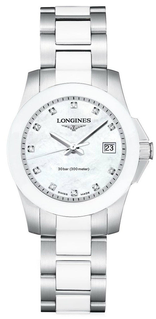 Longines Watch Conquest Ladies. Conquest ceramic, the elegance of performance. Longines Watches Conquest is the quintessential expression of the brands sporting elegance. Special attention went into the aesthetics of the bezel, the cabochon crown and the links, all made of ceramic. This exceptional material combines timeless glamour with novel technical features. A subtle blend of steel and ceramic, performance and elegance, Longines Conquest includes technical features that meet the requirements of the most demanding sportsmen and women. Both sober and sophisticated, these models are guaranteed to catch the eye at the most fashionable soirees as well as in the stands of prestigious horse races.