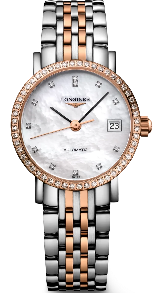 Presented in a stunning 25.5mm diamond decorated stainless steel and 18 carat rose gold case, this Longines Elegant Collection Ladies watch displays the L592 self-winding mechanical calibre through a transparent sapphire crystal case back, giving you an insight into the complex and intricate artistry that goes into making automatic movements. The Swiss watch calibre also provides classic hour, minute and seconds hands and a date window at 3 o clock displayed on a breathtaking white mother of pearl dial. The dial is also beautifully detailed with diamond dot indices and sleek black steel hands. Protecting the dial is high quality scratch resistant glass, a material famed for its scratch resistance and treated with an anti-reflective coating for easy legibility.