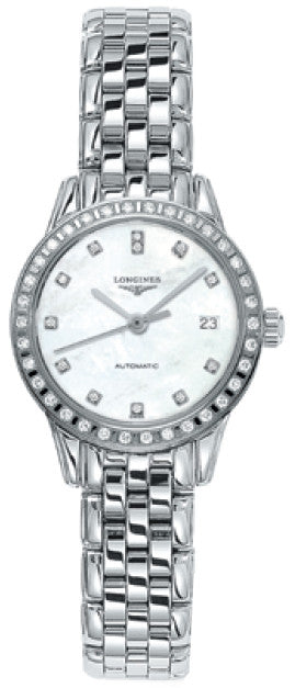This Longines Flagship Ladies watch is presented with a stunning 34 Top Wesselton diamond decorated 26mm stainless steel case and a delightful fine linked stainless steel bracelet which moulds beautifully to the contours of the wrist, perfectly straddling the line between a trustworthy timepiece and an elegant piece of jewellery. Housed within the case is the L592 self-winding mechanical calibre which can be witnessed through a transparent sapphire crystal case back giving you an insight into the complex and intricate artistry that goes into making automatic movements. The Swiss watch calibre also provides classic hour, minute and seconds hands and a date window at 3 o clock displayed on a mesmerising white mother of pearl dial. The dial is beautifully detailed with 12 sparkling diamond dot indices and sleek silvered polished hands and protected by high quality scratch resistant glass, a material famed for its scratch resistance and treated with an anti-reflective coating for easy legibility.