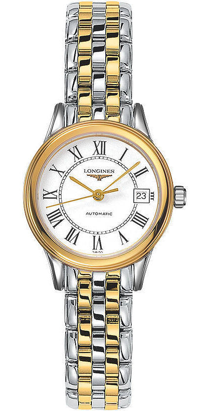 This Longines Flagship Ladies watch is presented with a stunning 26mm stainless steel and yellow gold PVD coated case and a delightful fine linked two toned bracelet which moulds beautifully to the contours of the wrist, perfectly straddling the line between a trustworthy timepiece and an elegant piece of jewellery. Housed within the case is the L592 self-winding mechanical calibre which can be witnessed through a transparent sapphire crystal case back giving you an insight into the complex and intricate artistry that goes into making automatic movements. The Swiss watch calibre also provides classic hour, minute and seconds hands and a date window at 3 o clock displayed on a crisp white matte dial. The dial is beautifully detailed with traditional painted Roman numerals and sleek yellow gold gilt hands and protected by high quality scratch resistant glass, a material famed for its scratch resistance and treated with an anti-reflective coating for easy legibility.