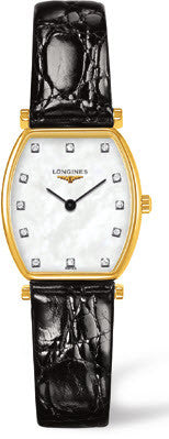The slim yellow gold plated stainless steel case of this Longines La Grand Classique Ladies watch comes to only 5mm thick and yet still manages to house a Swiss quartz movement celebrated for its unbeatable precision. Housed beneath the scratch resistant sapphire crystal glass is a mesmerising white mother of pearl dial that is beautifully decorated with painted Roman numerals and sleek steel hands. To fasten this gorgeous timepiece to your wrist, a luxurious black alligator leather strap is added alongside a yellow gold plated buckle.