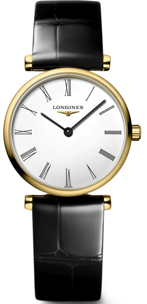 This Longines La Grande Classique Ladies watch instantly captures attention with its graceful white matte face, sleek black hands and traditional painted Roman numerals. Protecting the centrepiece dial is scratch resistant sapphire crystal glass treated with an anti-reflective coating for easy legibility. The remarkably slim case measures to a feminine 24mm in diameter and is crafted from luxurious yellow gold PVD coated stainless steel to pair with the black alligator leather strap and yellow gold PVD pin buckle. Embraced within is the classic L209 quartz movement, a Swiss made calibre which promises only the best in precision and the performance of the central hands for hours and minutes.