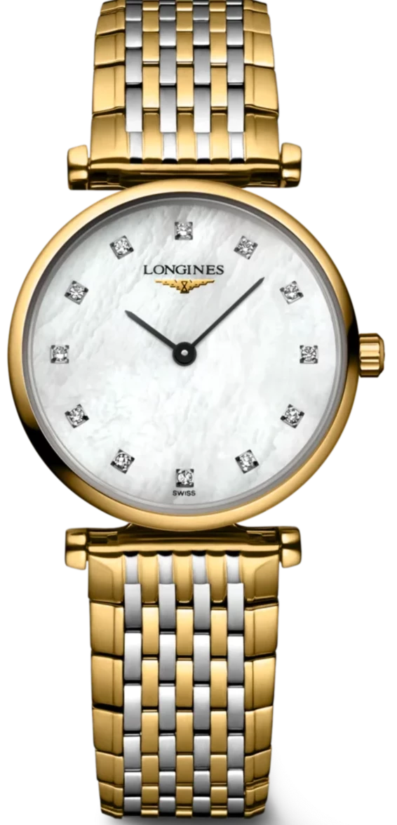 This Longines La Grande Classique Ladies watch instantly captures attention with its graceful white mother of pearl face, sleek black hands and dazzling diamond dot indices. Protecting the centrepiece dial is scratch resistant sapphire crystal glass treated with an anti-reflective coating for easy legibility. The remarkably slim case measures to a feminine 24mm in diameter and is crafted from luxurious yellow gold PVD coated stainless steel to pair with the matching two toned stainless steel and yellow gold PVD fine link bracelet with a triple safety folding clasp and push-piece opening mechanism. Embraced within is the classic L209 quartz movement, a Swiss made calibre which promises only the best in precision and the performance of the central hands for hours and minutes.