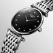 This Longines La Grande Classique Ladies watch instantly captures attention with its graceful black lacquered face, sleek polished hands and dazzling diamond dot indices. Protecting the centrepiece dial is scratch resistant sapphire crystal glass treated with an anti-reflective coating for easy legibility. The remarkably slim case measures to a feminine 24mm in diameter and is crafted from polished stainless steel to pair with the matching stainless steel fine link bracelet with a triple safety folding clasp and push-piece opening mechanism. Embraced within is the classic L209 quartz movement, a Swiss made calibre which promises only the best in precision and the performance of the central hands for hours and minutes.