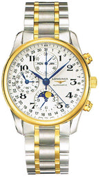 The polished two toned 18 carat yellow gold and stainless steel case of this Longines Master Collection watch measures to a neat 40mm in size and is fastened effortlessly to the wrist by a matching steel and gold bracelet and triple safety folding clasp. The L687 automatic movement equips the timepiece with hour and minutes hands, small seconds with 24 hours indicator at 9 o clock, half moon date central hand, moon phase display with 12 hours counter at 6 o clock, central 60 seconds hand and 30 minutes counter with day and month display at 12 o clock. The striking silver textured dial is the centrepiece of the watch as its beautifully decorated with sleek blue steel hands and painted Arabic numerals.