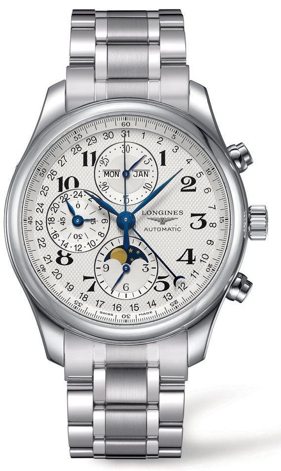The polished stainless steel case of this Longines Master Collection watch measures to a neat 42mm in size and is fastened effortlessly to the wrist by a matching stainless steel bracelet and triple safety folding clasp. The L687 automatic movement equips the timepiece with hour, minutes and small seconds, a 24 hours indicator at 9 o clock, moon phase window, column wheel chronograph and a power reserve of 54 hours. The striking silver textured dial is the centrepiece of the watch as its beautifully decorated with sleek blue steel hands and painted Arabic numerals.
