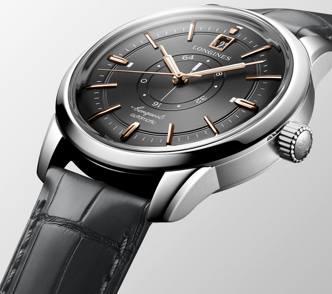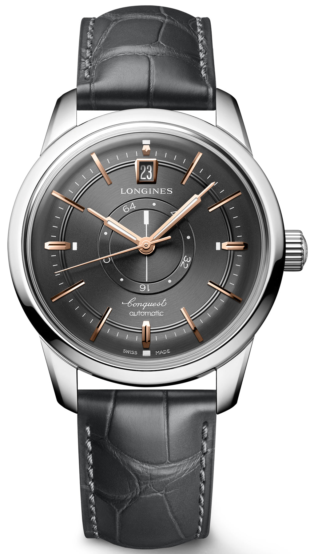Longines Watch Conquest Heritage Anthracite L1.648.4.62.2. To mark the Conquest collection’s 70th anniversary (1954-2024), Longines is revisiting one of its iconic timepieces with its new Conquest Heritage Central Power Reserve model. A striking tribute to the historic model, the power reserve indicator is revealed by two rotating discs in the centre of the dial. The three-part anthracite dial of this Conquest Heritage Power Reserve is flanked by twelve applied rose gold coloured hour markers. A fine circular thread separates the indexes and marks the minute track. Like the applied hour markers whose colours they adopt, the skyscraper style hour and minute hands are coated with Super- LumiNova®. This 38mm model is powered by the exclusive magnetism-resistant Longines L896.5 calibre.
