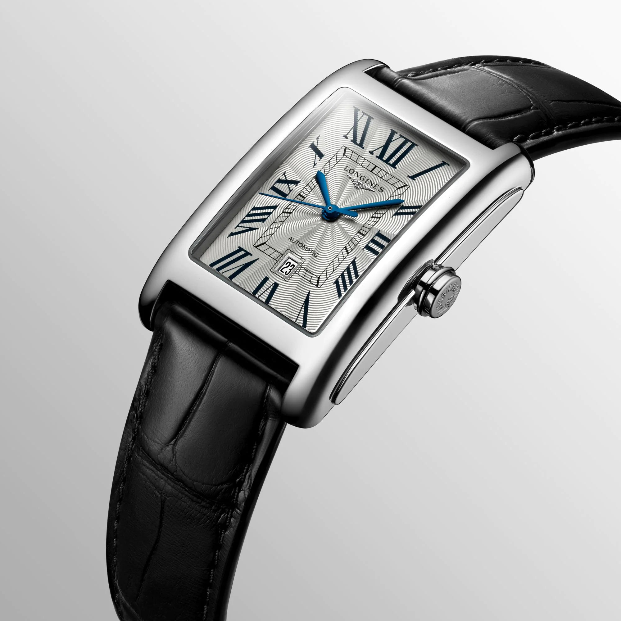 Enhanced by a timeless aesthetic, this Longines DolceVita is presented in a spotless rectangular shaped stainless steel case measuring to 43.8mm in height and 27.7mm wide. The case is also fitted with high quality scratch resistant sapphire crystal glass with anti-reflective treatment and a screw down case back to ensure its water resistance of 30 metres. To match the glistening finish of the case, this Longines Dolcevita watch for women showcases a mesmerising centrepiece dial decorated in a silver ‘flinque’ pattern with traditional painted Roman numerals and sleek blue steel hands. A small yet handy date window at 6 o clock continues to provide optimal functionality while the luxurious black alligator leather strap and stainless steel pin buckle add one final touch of comfort and sophistication.