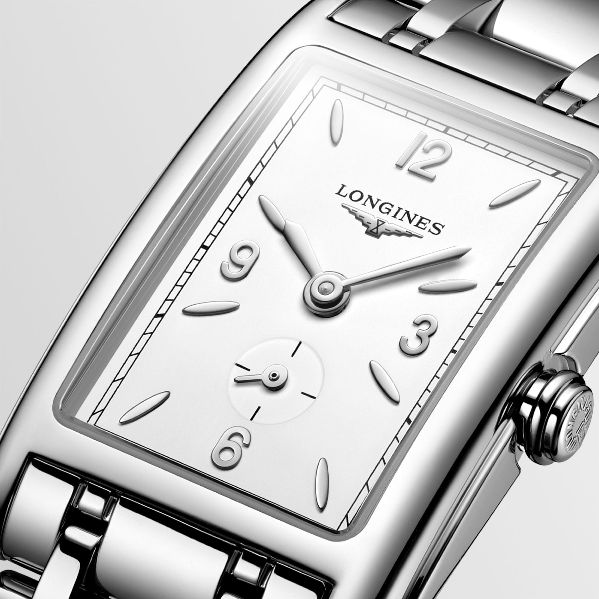 Enhanced by a timeless aesthetic, this Longines DolceVita is presented in a spotless rectangular shaped stainless steel case measuring to 32mm in height and 20.8mm wide. The case is also fitted with high quality scratch resistant sapphire crystal glass with anti-reflective treatment and a screw down case back to ensure its water resistance of 30 metres. To match the glistening finish of the case, this Longines Dolcevita watch for women showcases a mesmerising centrepiece dial decorated in a matte white finish with traditional applied indexes, Arabic numerals and sleek steel hands. A small yet handy subsidiary seconds dial at 6 o clock continues to provide optimal functionality while the luxurious stainless steel bracelet and triple safety folding clasp add one final touch of comfort and sophistication.