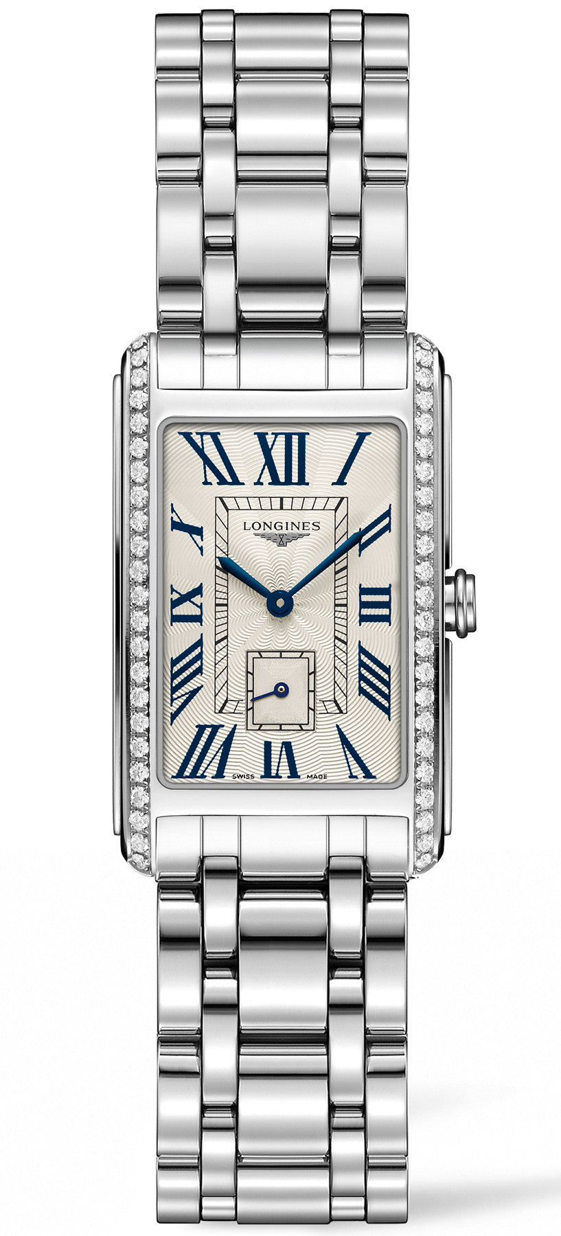 Enhanced by a timeless aesthetic, this Longines DolceVita is presented in a rectangular shaped stainless steel case measuring to 37mm in height and 23mm wide and set with 46 Top Wesselton diamonds. The case is also fitted with high quality scratch resistant sapphire crystal glass with anti-reflective treatment and a screw down case back to ensure its water resistance of 30 metres. To match the glistening finish of the case, this Longines Dolcevita watch for women showcases a mesmerising centrepiece dial decorated in a silver flinque finish with traditional painted Romain numerals and sleek blue steel hands. A small yet handy subsidiary seconds dial at 6 o clock continues to provide optimal functionality while the luxurious stainless steel bracelet and triple safety folding buckle add one final touch of comfort and sophistication.