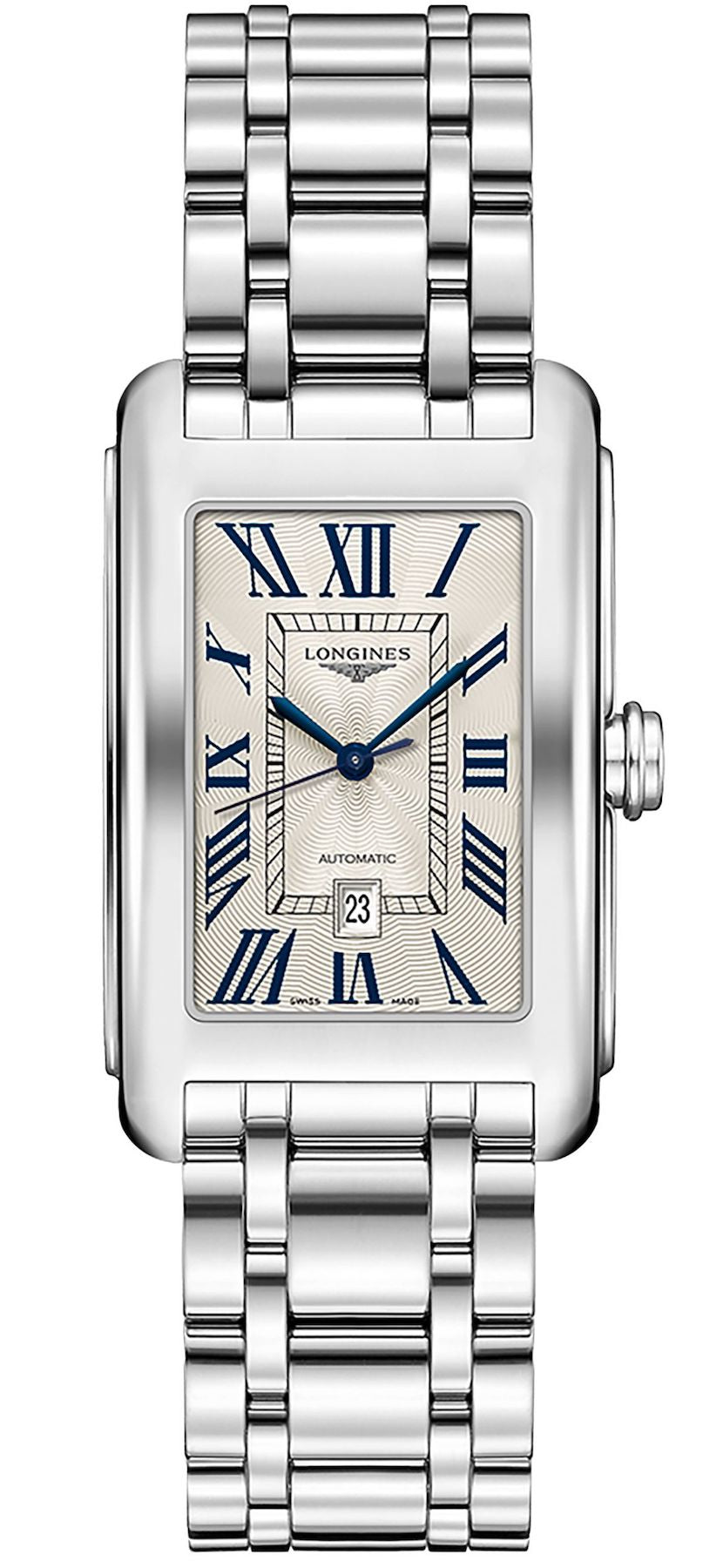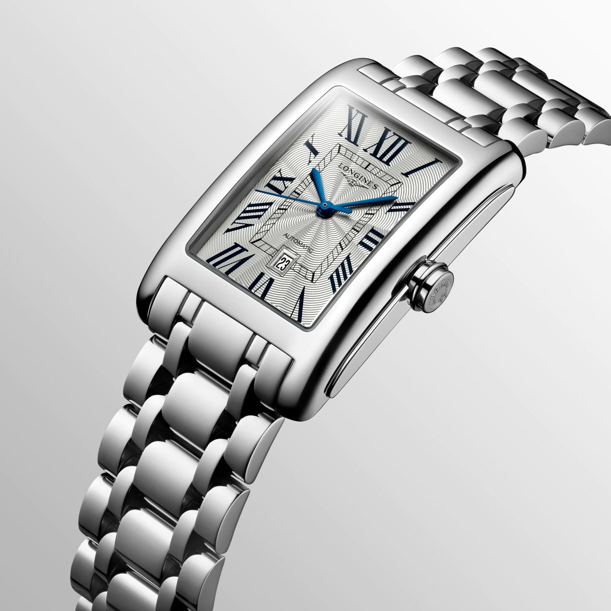 Enhanced by a timeless aesthetic, this Longines DolceVita is presented in a spotless rectangular shaped stainless steel case measuring to 43.8mm in height and 27.7mm wide. The case is also fitted with high quality scratch resistant sapphire crystal glass with anti-reflective treatment and a screw down case back to ensure its water resistance of 30 metres. To match the glistening finish of the case, this Longines Dolcevita watch for women showcases a mesmerising centrepiece dial decorated in a silver ‘flinque’ pattern with traditional painted Roman numerals and sleek blue steel hands. A small yet handy date window at 6 o clock continues to provide optimal functionality while the luxurious stainless steel bracelet and triple safety folding clasp add one final touch of comfort and sophistication.