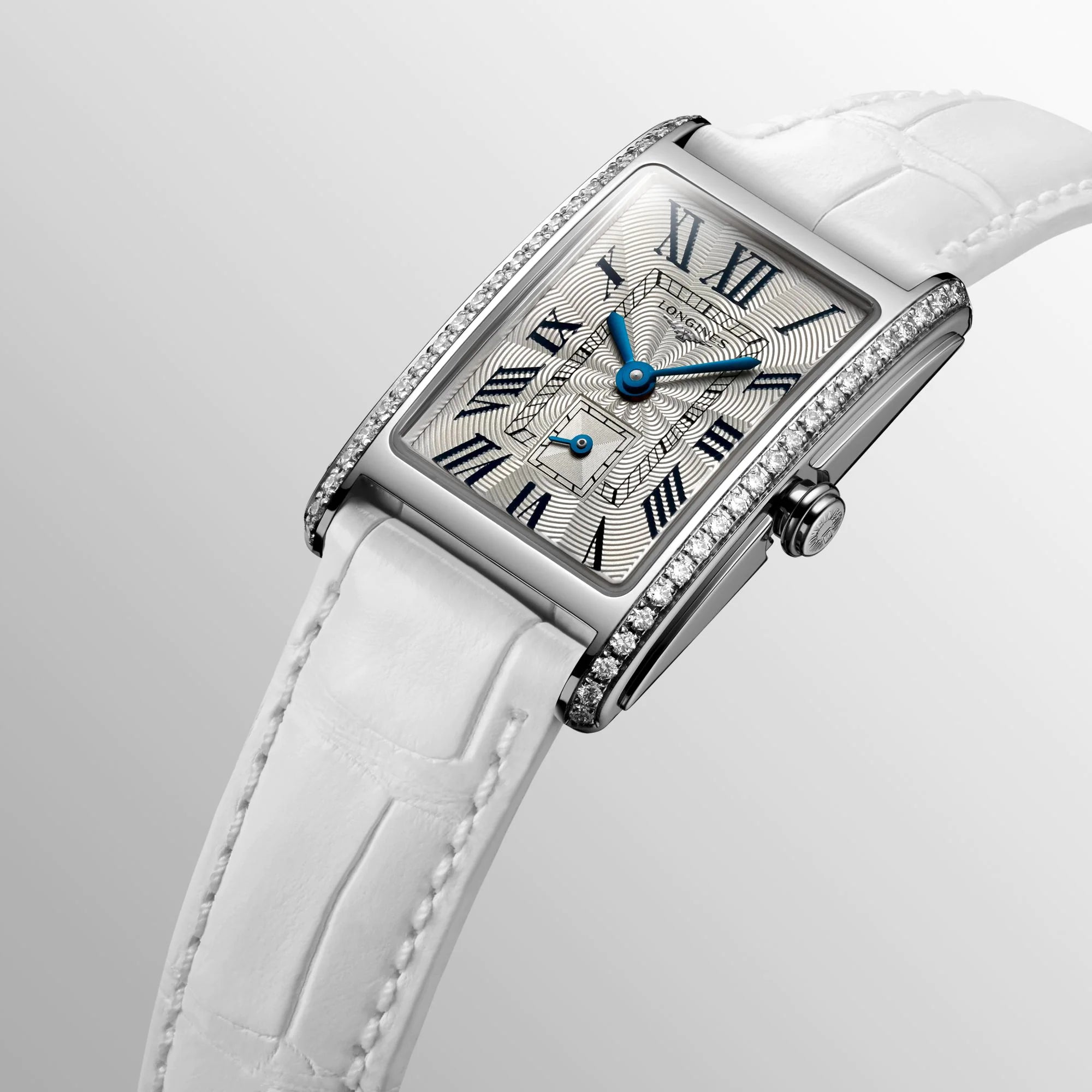 Enhanced by a timeless aesthetic, this Longines DolceVita watch is presented in a rectangular shaped stainless steel case measuring to 32mm in height and 20.8mm wide and decorated in an array of Top Wesselton diamonds. The case is also fitted with high quality scratch resistant sapphire crystal glass with anti-reflective treatment, a stainless steel crown and a screw down case back to ensure its water resistance of 30 metres. To match the glistening finish of the case, this Longines Dolcevita watch for women showcases a mesmerising centrepiece dial decorated in a silver flinque pattern, traditional Blue roman numerals and matching blue hands for hours and minutes. A small yet handy subsidiary seconds dial at 6 o’ clock continues to provide optimal functionality while the luxurious white alligator leather strap and stainless steel pin buckle adds one final touch of comfort and sophistication.