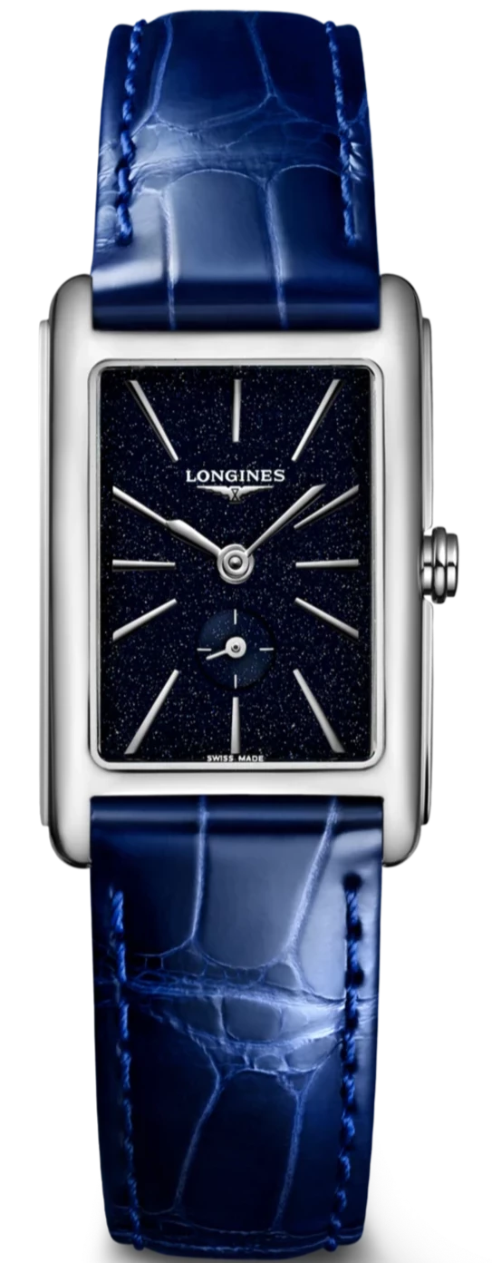 Enhanced by a timeless aesthetic, this Longines DolceVita is presented in a rectangular shaped stainless steel case measuring to 32mm in height and 20.8mm wide. The case is also fitted with high quality scratch resistant sapphire crystal glass with anti-reflective treatment, a stainless steel crown and a screw down case back to ensure its water resistance of 30 metres. To match the glistening finish of the case, this Longines Dolcevita watch for women showcases a mesmerising centrepiece dial decorated in a sparkly blue finish, traditional indexes and sleek steel hands. A small yet handy subsidiary seconds dial at 6 o’ clock continues to provide optimal functionality while the luxurious blue alligator leather strap and stainless steel pin buckle adds one final touch of comfort and sophistication.