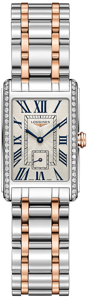 Enhanced by a timeless aesthetic, this Longines DolceVita is presented in a rectangular shaped stainless steel case measuring to 32mm in height and 20.8mm wide decorated with 46 Top Wesselton diamonds. The case is also fitted with high quality scratch resistant sapphire crystal glass with anti-reflective treatment, an 18 carat rose gold crown and a screw down case back to ensure its water resistance of 30 metres. To match the glistening finish of the case, this Longines Dolcevita watch for women showcases a mesmerising centrepiece dial decorated in a silver ‘flinque’ finish, traditional painted Roman numerals and sleek blue steel hands. A small yet handy subsidiary seconds dial at 6 o clock continues to provide optimal functionality while the luxurious two toned 18 carat rose gold and stainless steel bracelet and triple safety folding buckle add one final touch of comfort and sophistication.