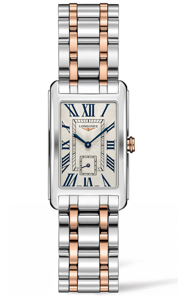Enhanced by a timeless aesthetic, this Longines DolceVita is presented in a rectangular shaped stainless steel case measuring to 37mm in height and 23.3mm wide. The case is also fitted with high quality scratch resistant sapphire crystal glass with anti-reflective treatment, an 18 carat rose gold crown and a screw down case back to ensure its water resistance of 30 metres. To match the glistening finish of the case, this Longines Dolcevita watch for women showcases a mesmerising centrepiece dial decorated in a silver flinque finish with traditional painted Romain numerals and sleek blue steel hands. A small yet handy subsidiary seconds dial at 6 o clock continues to provide optimal functionality while the luxurious two toned rose gold and stainless steel bracelet and triple safety folding buckle add one final touch of comfort and sophistication.