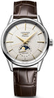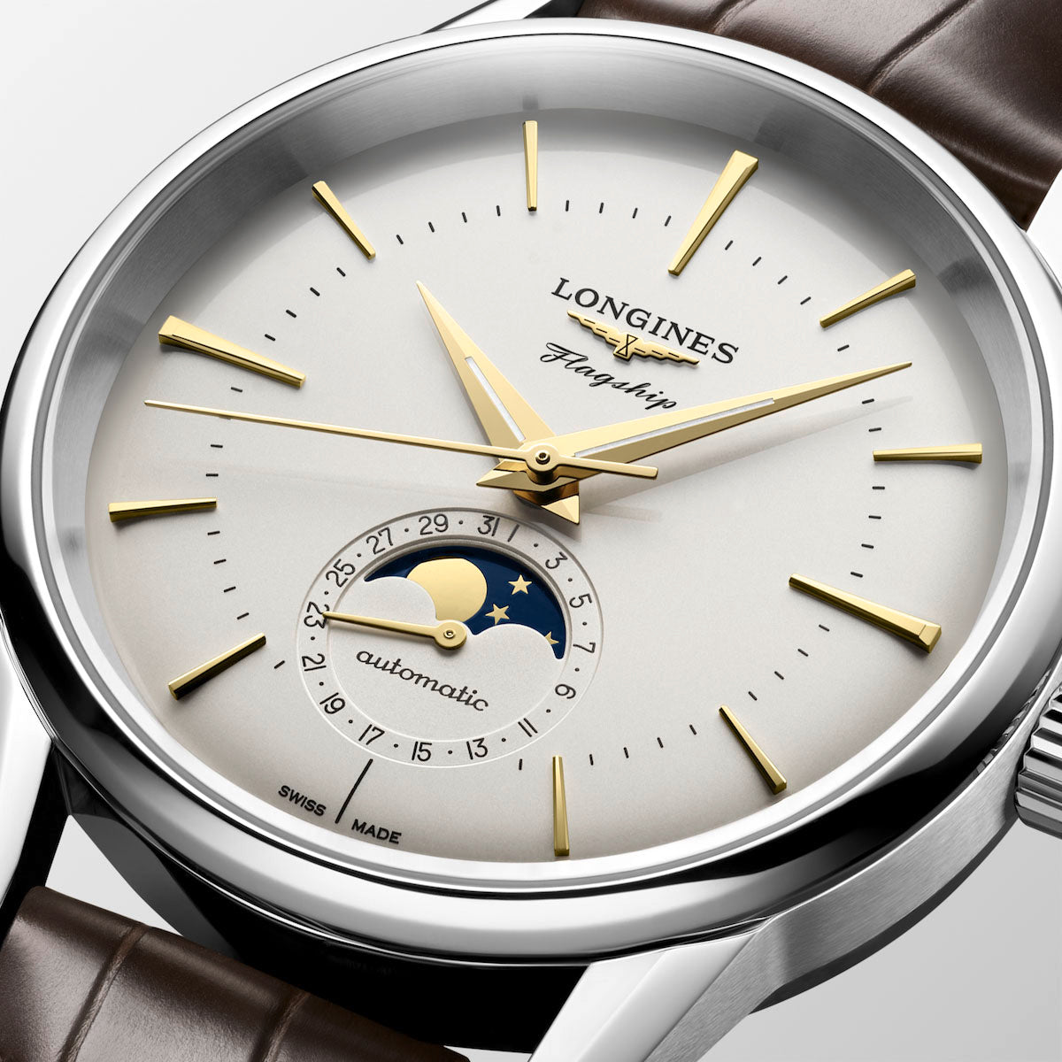 Longines Watch Flagship Heritage L4.815.4.78.2. Featuring a moon phase complication have been added to the Flagship Heritage line. It is located on a small dial with a date hand at 6 o'clock. A silicon balance spring drives an exclusive Longines movement that is anti-magnetic. The screw-down steel case has a diameter of 38.5 mm. It reveals satin-brushed finishes, with shortened and chamfered lugs. This model features a domed silvered opaline dial enhanced by 11 applied hour markers and golden hands. It has a brown leather strap fitted with a new Heritage pin buckle.