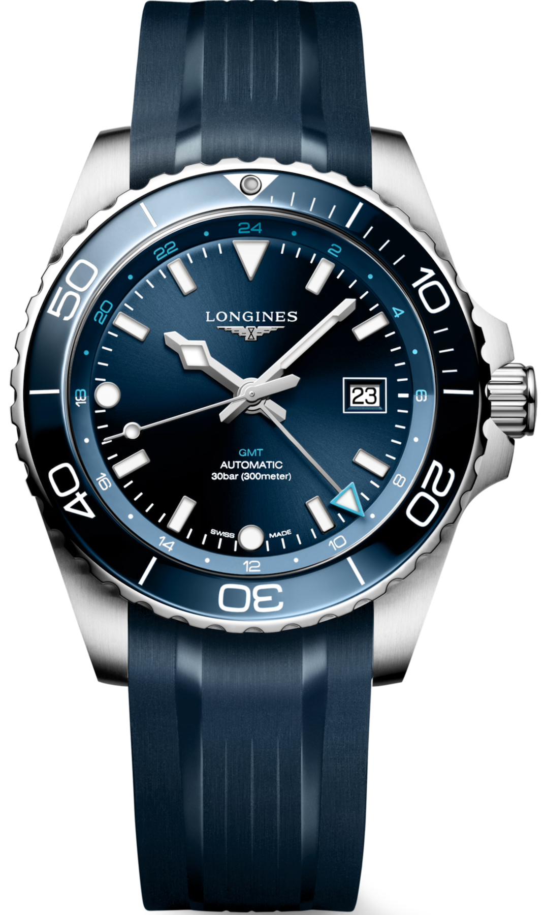 Longines Watch Hydroconquest GMT Sunray Blue Rubber L3.890.4.96.9. Founded in 1832 in Saint-Imier, the famous Swiss watch brand Longines can boast a long tradition characterised by the elegance and performance of its products. Those values are perfectly represented by The Longines Sport Collection. The HydroConquest line is dedicated to men and women looking for a high performance timepiece that combines technical innovation and elegance.