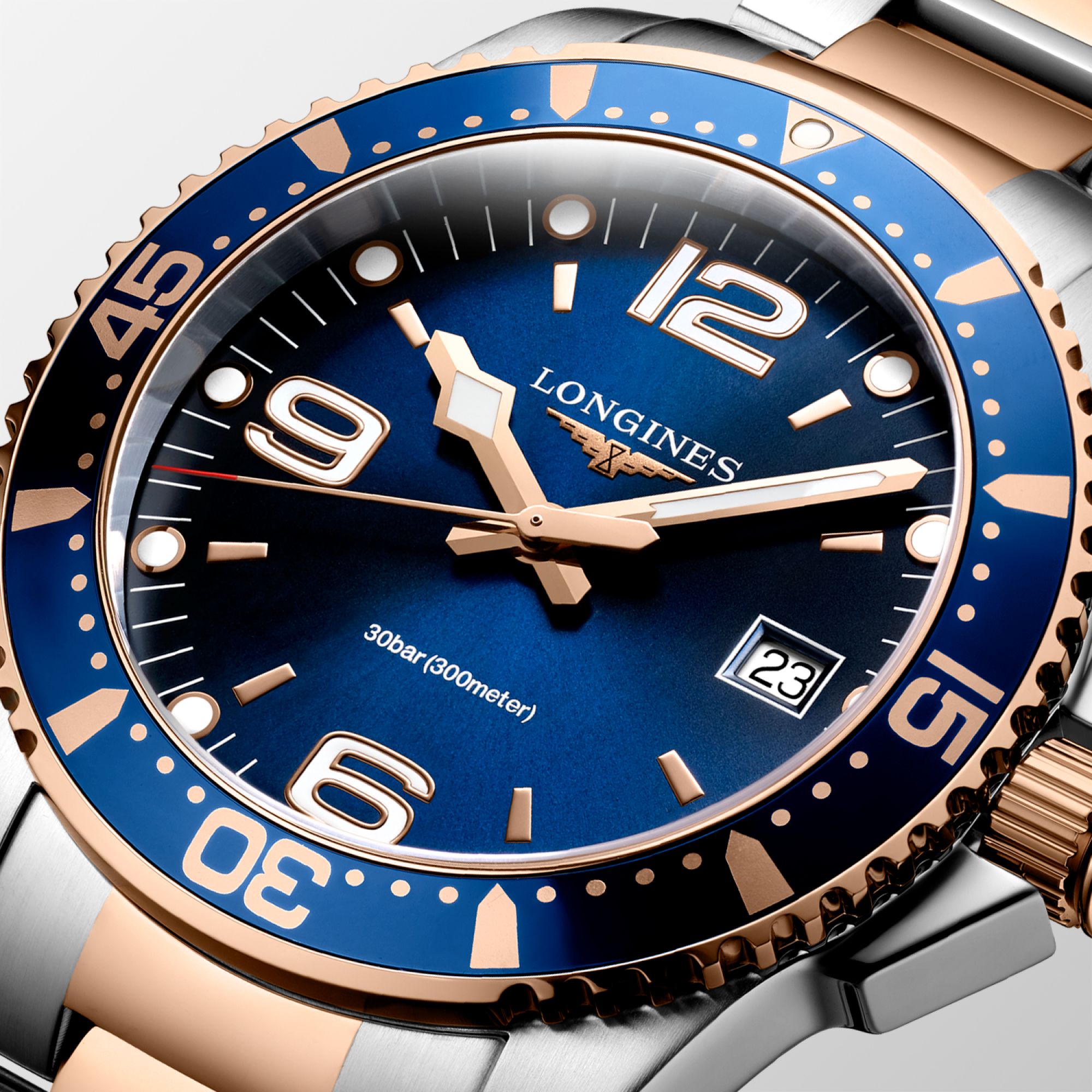 For easy legibility under the waves, at the office or out on the town, this Longines HydroConquest watch is complimented by a striking blue sunray dial adorned with large Arabic numerals and large rose gold plated hands coated in glow in the dark Superluminova. Housed above the dial is high quality scratch resistant sapphire crystal glass, a material famed for its scratch resistance and treated with an anti-reflective coating for even better legibility. The central hands for hour, minutes and seconds and date window at 3 o clock are powered by one of the Swiss watch manufacturer’s most legendary quartz movements, the L157 calibre which comes fitted with a special End of Life indicator. To complete the sporty finish, the Longines men’s watch is fitted with a two toned stainless steel and rose gold plated bracelet and a double safety folding clasp with a push-piece opening mechanism.