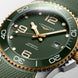 For easy legibility under the waves, at the office or out on the town, this Longines HydroConquest watch is complimented by a striking matte green dial adorned with large Arabic numerals and yellow gold hands coated in glow in the dark Superluminova. Housed above the dial is high quality scratch resistant sapphire crystal glass, a material famed for its scratch resistance treated with an anti-reflective coating for even better legibility. The central hands for hour, minutes and seconds and date window at 3 o clock are powered by one of the Swiss watch manufacturer’s most legendary automatic movements, the L888 calibre which promises a power reserve of 64 hours. To complete the sporty look of this the Longines men’s watch, the steel case is fitted with a khaki green rubber strap and a double safety folding clasp with a push-piece opening mechanism.