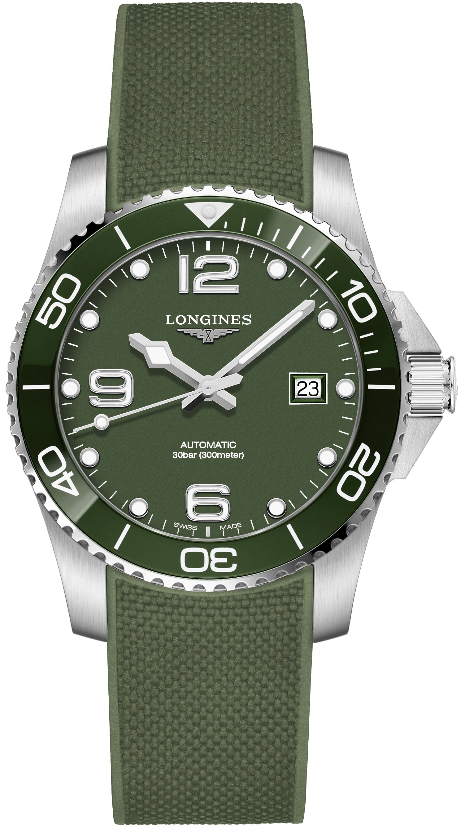 For easy legibility under the waves, at the office or out on the town, this Longines HydroConquest watch is complimented by a striking green matte dial adorned with large Arabic numerals and large silvered hands coated in glow in the dark Superluminova. Housed above the dial is high quality scratch resistant sapphire crystal glass, a material famed for its scratch resistance and treated with an anti-reflective coating for even better legibility. The central hands for hour, minutes and seconds and date window at 3 o clock are powered by one of the Swiss watch manufacturer’s most legendary automatic movements, the L888 calibre which also promises a power reserve of 64 hours. To complete the sporty finish, the Longines men’s watch is fitted with a green rubber strap and a double safety folding clasp with a push-piece opening mechanism.
