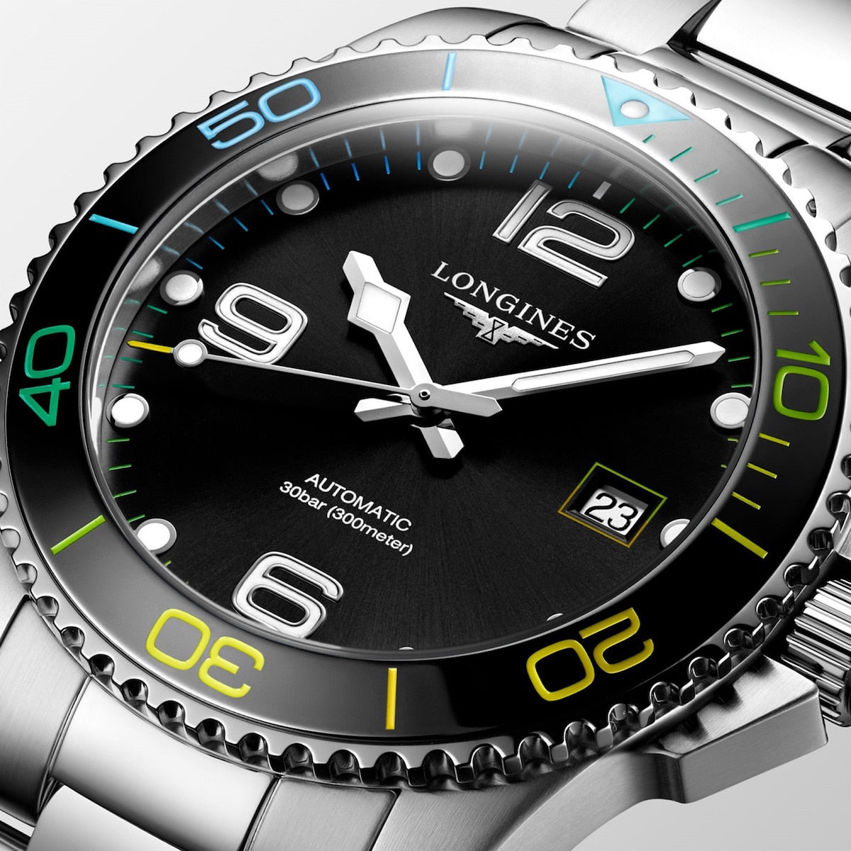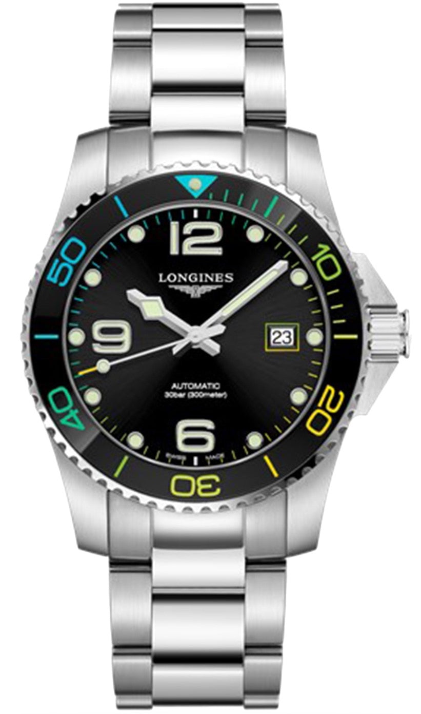 Longines Watch HydroConquest XXII Commonwealth Limited Edition L3.781.4.59.6. As the Official Partner and Timekeeper of the 2022 Commonwealth Games, Longines presents the HydroConquest XXII Commonwealth Games. This exclusive edition, limited to 2022 pieces, celebrates one of the world’s greatest sporting events, which sees athletes from over 70 Commonwealth nations and territories compete against each other. The watches in this line are distinguished by their daring design, taking up the codes of diving and aimed at demanding athletes. Water resistance to 300 metres, a unidirectional rotating bezel, a screw down crown and case back, and a double security folding clasp with an integrated diving extension piece are all features that emphasise the style of these timepieces. The HydroConquest XXII Commonwealth Games watch proudly displays the vivid colours of the event logo on its black ceramic bezel, as well as on the minute track of its black sunray dial. Its 41 mm steel case contains an exclusive self winding movement with a silicon balance spring to ensure high precision and a longer life span. These characteristics further enhance high level performance and allow Longines to provide this watch with a 5 year warranty.